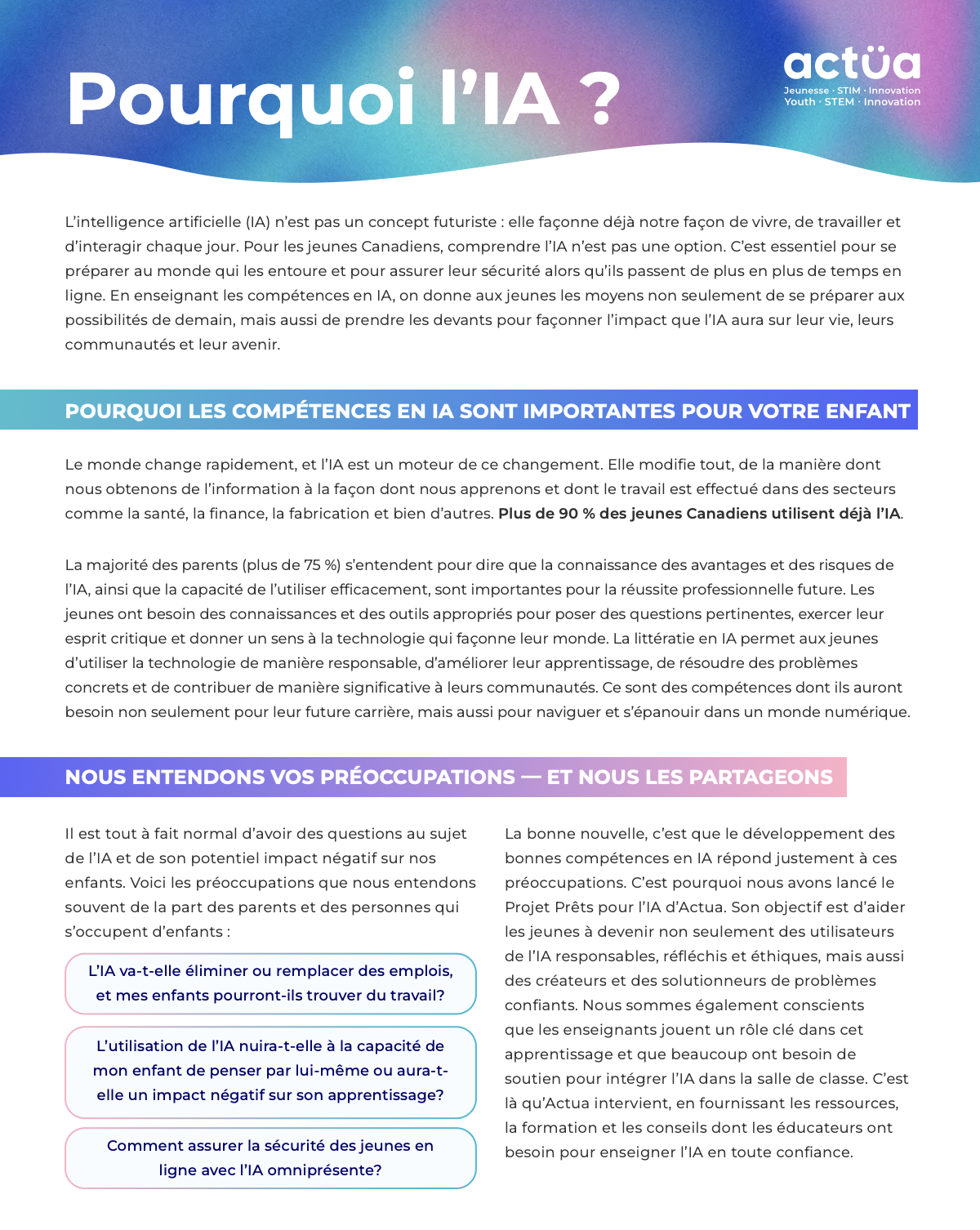 Actua bâtit dès aujourd’hui l’avenir canadien prêt pour l’IA – en jetant les bases d’un leadership responsable en matière d’IA et en dotant les jeunes, les éducateurs et les parents des compétences nécessaires en IA pour prospérer dans cette nouvelle ère. Les programmes d’Actua reconnaissent que les compétences en IA ne sont pas uniquement techniques. Notre programmation développe les capacités de pensée critique, de résolution de problèmes et de prise de décision éthique qui sont indispensables dans toutes les professions.
